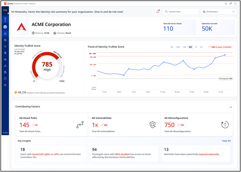 ETM Identity enablesorganizations to proactively reduce both human and non-human identity-related risks. It unifies visibility, context, and remediation across all identity and access management (IAM) systems, including on-premises Active Directory, Microsoft Entra ID, cloud identity providers (IdPs), and Identity as a Service(IDaaS)platforms, and correlates identity and asset risk into a single Identity TruRisk™ score. This allows security teams to focus on the most exploitable attack paths and automate remediation from detection through verified resolution, measurably shrinking the attack surface. By targeting lateral movement paths and securing high-risk service and machine identities, which are often the root cause of lateral movement in breaches, ETM Identity strengthens resilience and materially reduces identity-related breach potential.