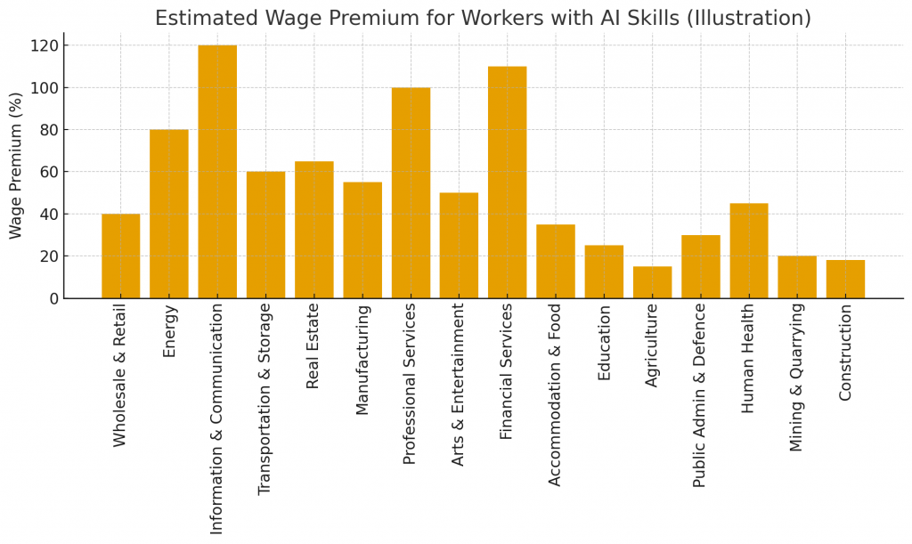 This boost is translating into paychecks: wages in AI-exposed industries are rising twice as fast, and workers with AI skills command a 56% premium.